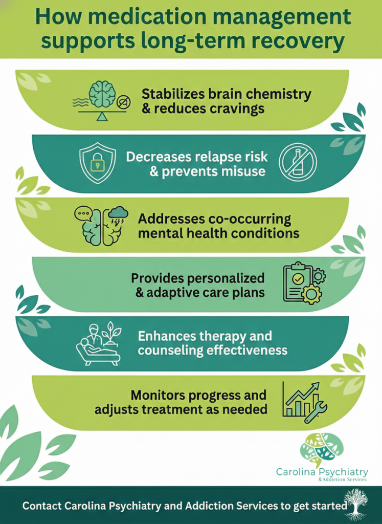 Medication management allows providers to treat both addiction and underlying mental health conditions at the same time. When anxiety, depression, or trauma symptoms are properly managed, individuals are less likely to self-medicate with drugs or alcohol.